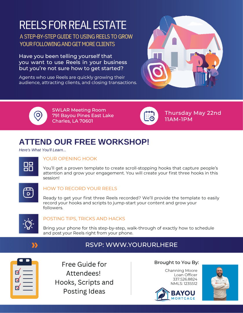 Channing Moore, Owner of Bayou Mortgage, provides a step-by-step guide to using reels to grow your following and get more clients. Here's what you'll learn: your opening hook, how to record your reels, posting tips, tricks, and hacks. REELSFORREALESTATE Have you been telling yourself that you want to use Reels in your business but you’re not sure how to get started? Agents who use Reels are quickly growing their audience, attracting clients, and closing transactions.